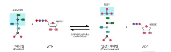 크레아틴은 3인산인 ATP(adenosine triphosphate) 결핍 시 2인산 ADP (adenosine diphosphate)에 제공하여