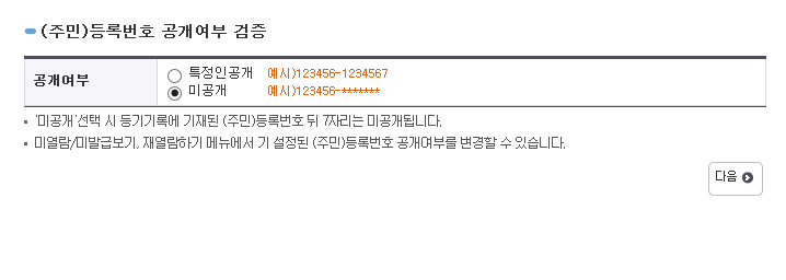 등기부 등본에 등록되어 있는 주민등록번호 공개 여부도 보실 수 있지만
